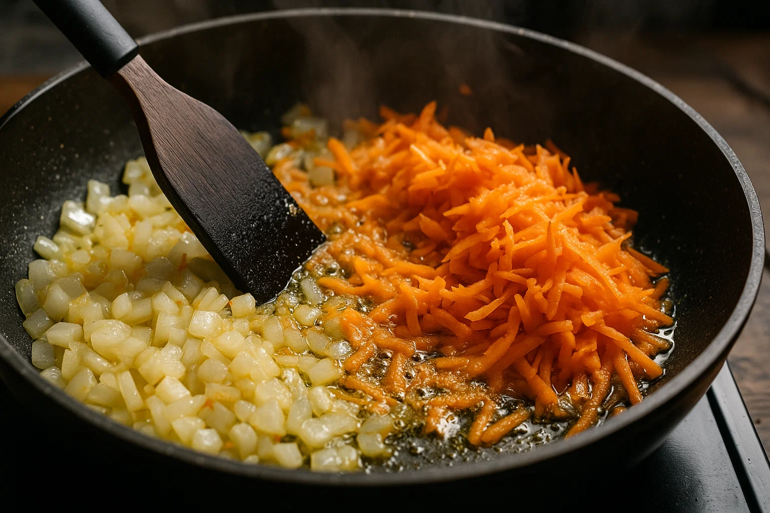 Совет: не жарь лук и морковь одновременно с самого начала. Лук готовится быстрее, и в итоге морковь может остаться сырой.